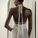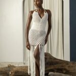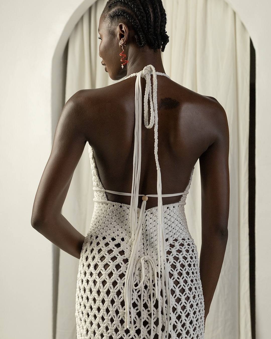 Boho rope-art dress with braided ropes, wood beads, contoured lines, and adjustable ties.