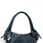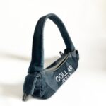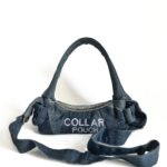 A bold, upcycled mini bag featuring a collar handle, detachable strap, and side pockets—each one uniquely handmade from discarded materials.