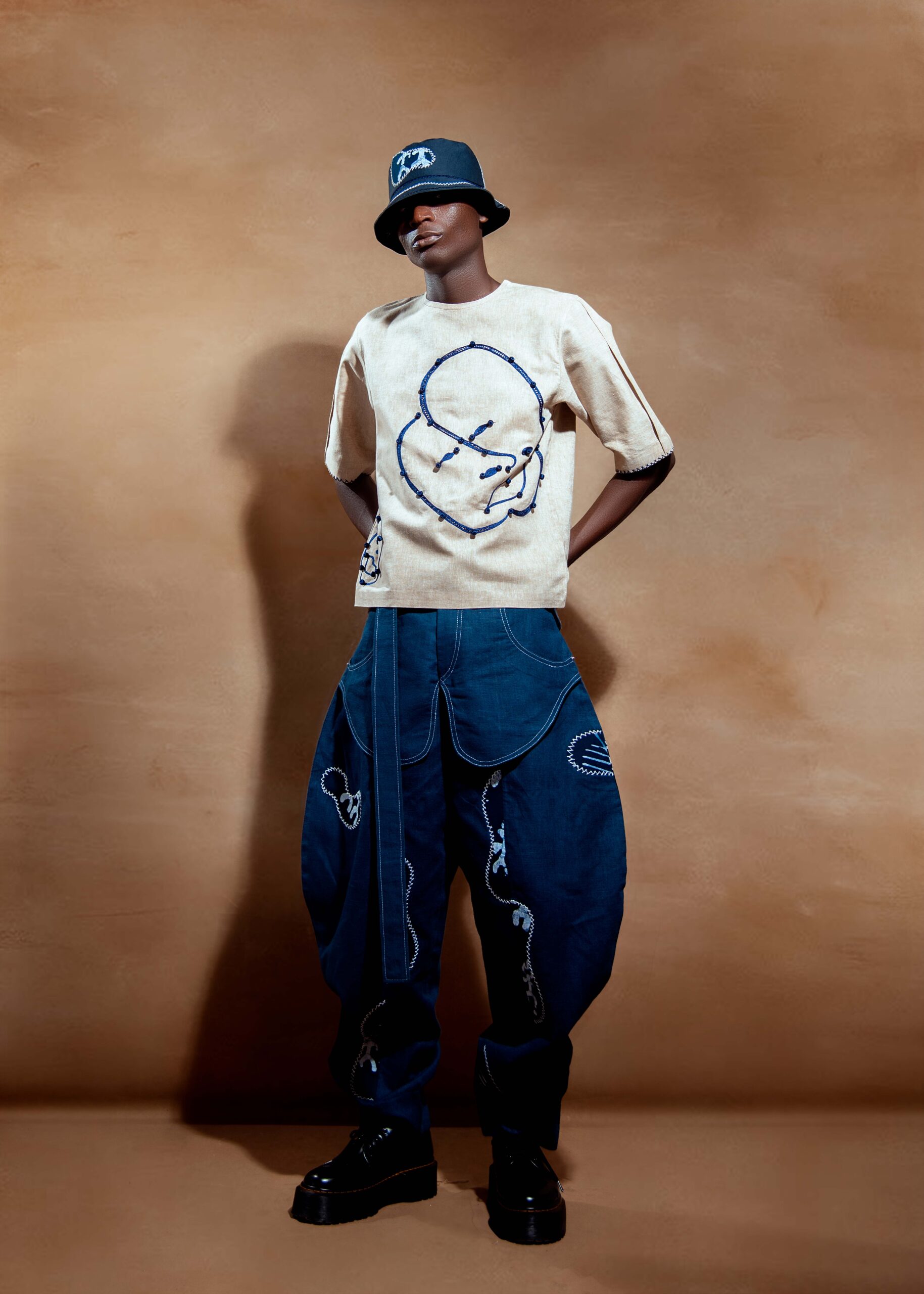 Balloon silhouette linen pants with hand-embroidered cotton patches and detailed finishing.