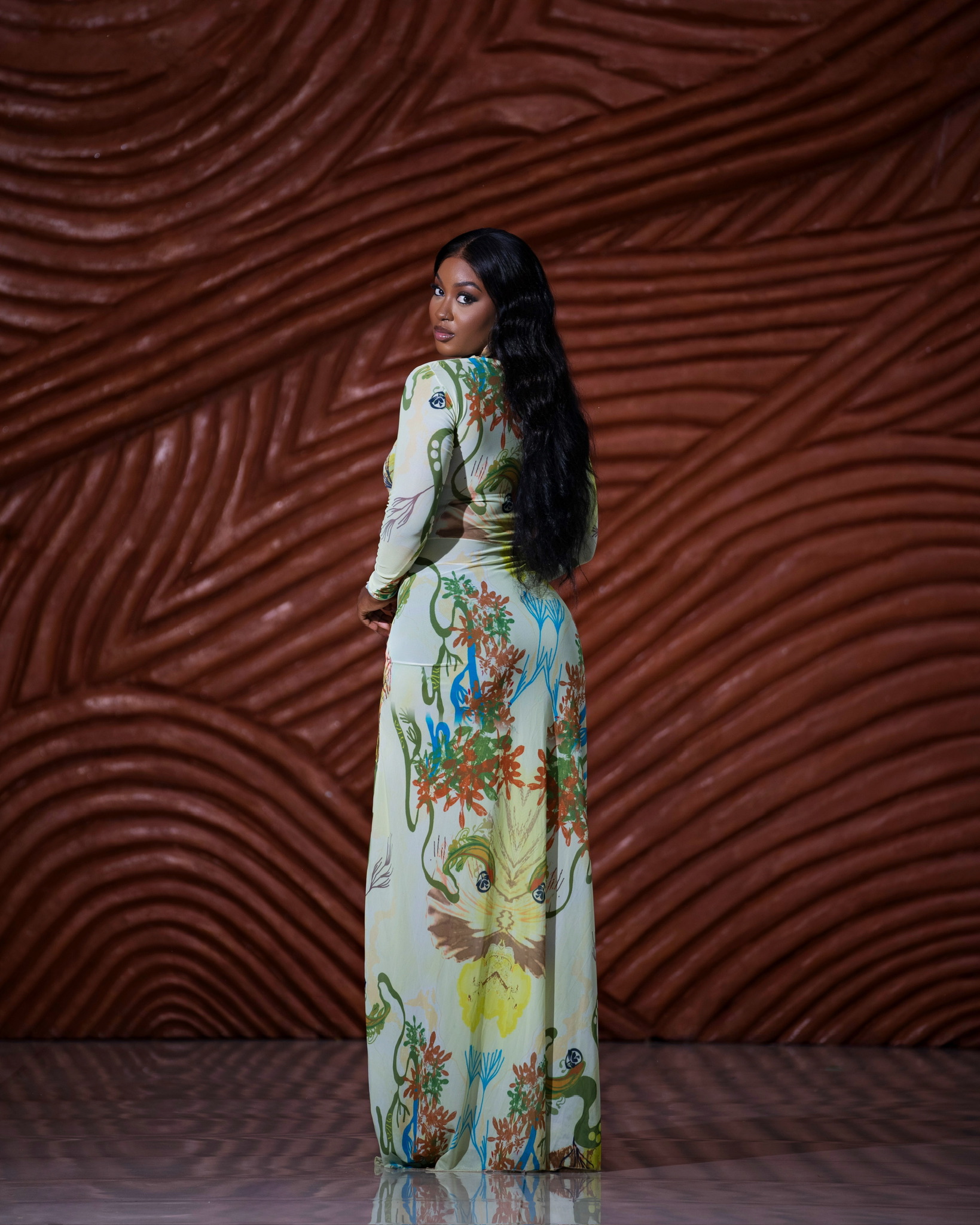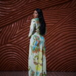 The Mela Dress moves like a dream- soft, fluid and impossibly feminine. Designed in our original wildflower print, it skims the body with gentle draping that gathers at the waist before cascading into a floor-grazing silhouette. The high neckline and long sleeves bring a quiet elegance, while the thigh-high slit adds just enough intrigue. She’s the dress that turns presence into poetry.