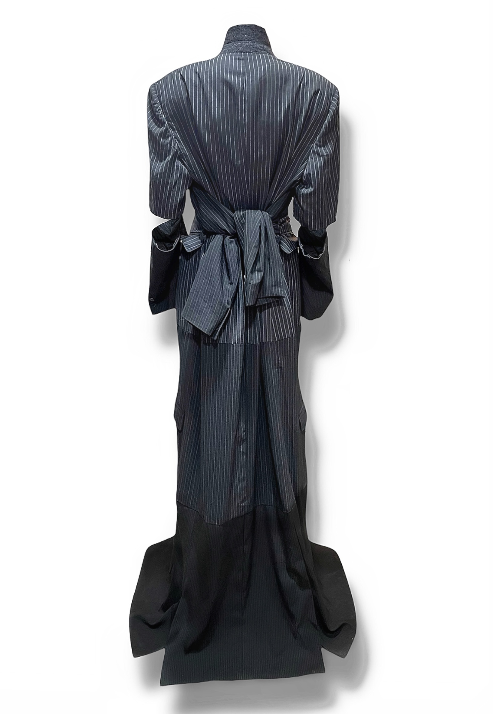 A two-tiered, hand-dyed wrap skirt crafted from repurposed shirts, celebrating individuality through layers, ties, and unexpected shirting details.